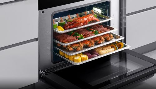 以老板电器大腔蒸烤集成灶为例,75L以上的大容量实现了容量跃迁,一次蒸烤即可摆满12道中式佳肴,可以轻松应对不同烹饪场景,朋友聚会、家人团聚时一次能蒸的下全家人的美味。大腔也可以更好地应对大型食材,长条鱼、帝王蟹、蒸烤整鸡、烤鸭、羊排等一次就能搞定,美食体验更加丰富。
