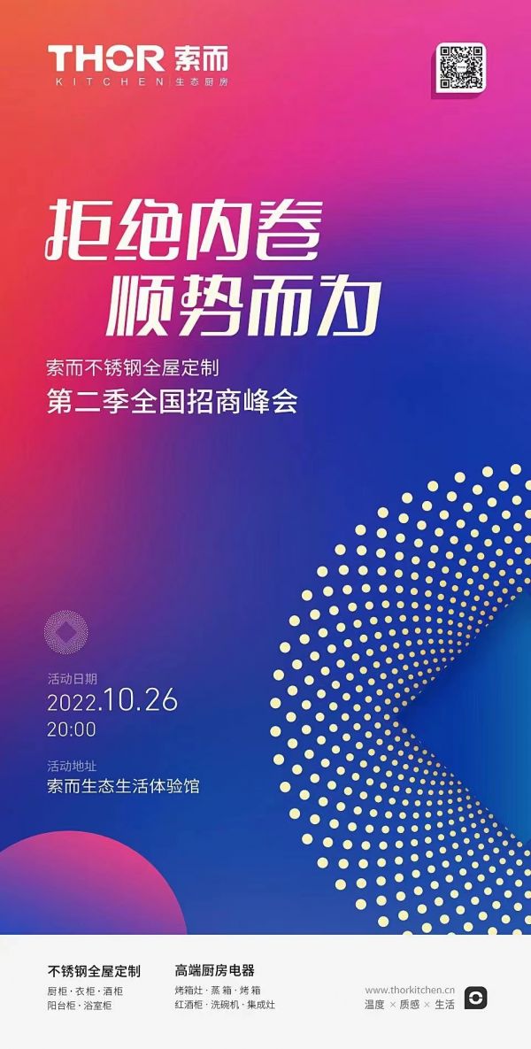 面对客户迫切的合作需求,THOR索而特别借助线上招商平台和互联网力量搭建了更高效、更智能多元的线上招商直播活动,将于10月26日开展“拒绝内卷 顺势而为”线上招商会,将品牌、产品优势及招商加盟帮扶政策传递给屏幕前的全国意向加盟商,把原定于投入在上海厨卫展的费用拿出来充实这次线上线下招商会的各项优惠政策,多措并举回馈新进加盟商,共享高速发展新机遇!