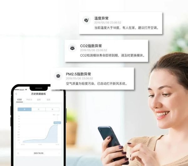 五大指标每秒更新,同时支持自动消息提示,当监测到环境指数或运行异常时,西蒙智享APP自动推送消息提醒用户及时关注。