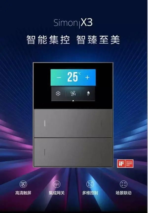 Simon X3智能集控面板,集高清触屏与场景按键于一体,有效释放家居空间,操控更直观便捷,通过滑动和点击屏幕,可操控家中灯具等设备,结合APP远程控制与智能音箱语音控制,令智能生活不止眼前所见;集成ZigBee3.0网关,无需额外购置网关,联动Simon智能生态设备,打造始终如一的生活舒适区。将常用设备添加在界面,一键即可打造专属场景,无需繁琐操控,悦享最enjoy的居家时刻。