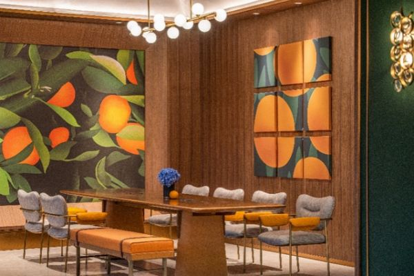 以桔色与绿色为主基调,木制材料和金属勾勒轮廓与边界的轮廓,球形吊灯、复古美式多彩的家具、各处穿插的桔子背景墙、地毯、版画,取材于热带植物的餐厅编藤座椅等设计,酒店空间更多以清新植被装饰,重现自然之美。让人恍若沐浴在加州阳光下,桔园般的清新愉悦和温暖阳光的宠溺环绕。