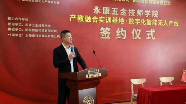 永康市职业技术学校校长、永康五金技师学院常务副院长王钟宝在致辞中说,永康是全国闻名的“五金之都”,作为全国最大的五金生产基地和专业市场,永康拥有五金制造类企业 5.3 万余家,从业人员54.36万人,随着产业的转型升级,技能人才短缺的矛盾越来越严重,亟需大量的高技能人才。永康五金技师学院总投资23.7亿元,建设用地581亩、建筑面积40万平方米的新校园。到2025年,一所全日制在校生超1万人,年培训2万人次的现代化校园将拔地而起。今天在学院内举行《产教融合实训基地·数字化智能无人产线项目》签约仪式,正式建立校企合作办学的关系。这是校企合作的一个重大案例,是产教融合的一个标志性举措,在永康五金技师学院发展历史中具有里程碑的意义。朗松智能科技有限公司是一个做智慧型无人工厂的高科技企业,相信我们的强强联合,一定能培养出更多的数字化高技能人才。