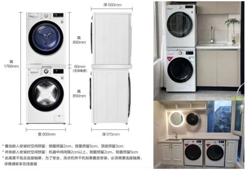 洗衣机与干衣机的尺寸分别为:600mm*615mm*850mm和600mm*660mm*850mm(长宽高顺序),对于居住面积较小的家庭来说,它们可以上下叠放,空间利用率更高。