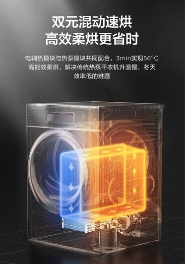 其一,UV紫外线除菌技术,通过内置高频短波紫外线灯,可将隐形螨虫瞬间杀灭,穿透衣物纤维缝隙进行全面抑菌除螨;第二,利用NTC温度传感器和MEMS精准判干技术,对烘衣时间和温度进行精准控制,在快速烘干衣物的同时,强效破坏各类病原菌和特定微生物孢子,形成全效灭菌舱态;最后,双元混动速烘技术,将电辅热模块与热泵模块相配合,可3分钟内实现56℃高能效柔烘,解决传统热泵干衣机升温慢、冬天烘干效率低的难题。