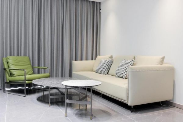 【倪兴生】:作为改善型住宅,设计需要在合理地规划空间及功能之外,呈现空间的品质和艺术性。为了追求自然触感,本案选用了许多天然材料来呈现居住空间的包容性,又通过对材质粗糙和细腻的两种不同处理,让距离感和亲和力这种矛盾的差异同时存在。这种恰到好处的陌生感正是现代人隔绝生活与工作的屏障,也是对我们所熟悉的都市生活若近若离的新生活态度,石材和木材的轮廓线有序地递进,缓解视觉上的疲劳感。