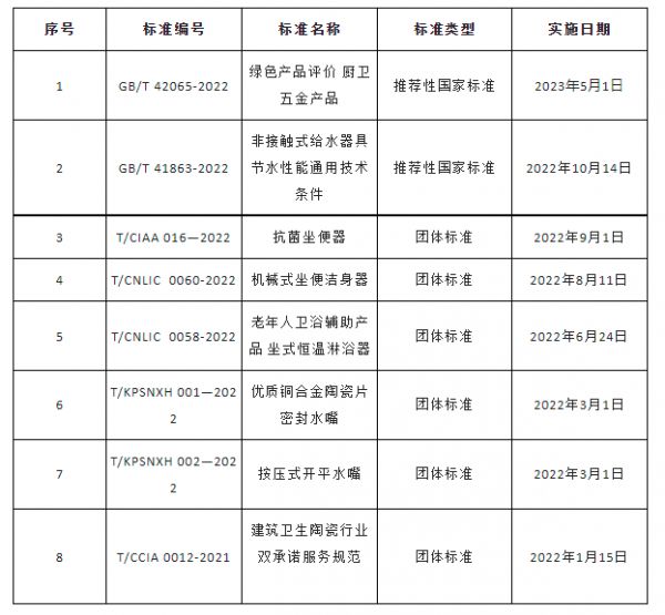 据不完全统计,2022年前三季度,卫浴行业新增8项标准,其中国家标准2项、团体标准6项。除《绿色产品评价 厨卫五金产品》于2023年5月实施外,其余7项标准目前已发布实施。