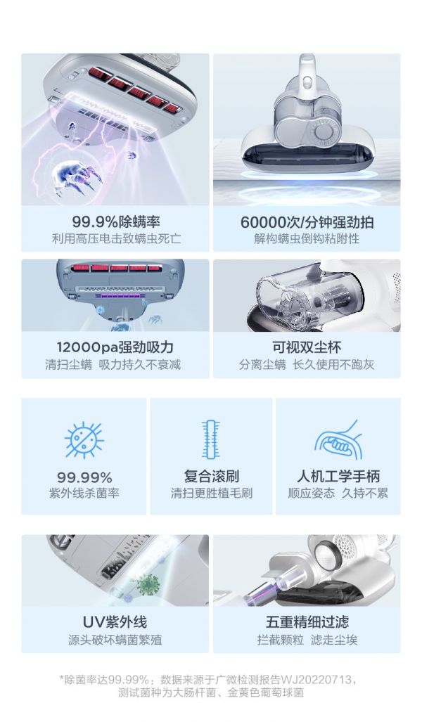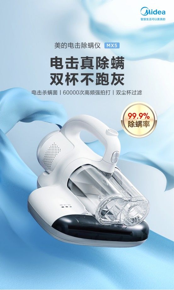 本次重磅推出的美的除螨仪MX5,除了升级双尘杯设计,同时采用的专利高压电击技术,通过高压电离空气电离出的负离子破坏螨虫、细菌结构,革新行业除螨方式,再配合每分钟60000次的高频拍打、高达12000Pa的强劲吸力、以及UV 紫外线的双重加持,将被褥等厚重织物深层的螨虫消除干净,实现深度清洁。