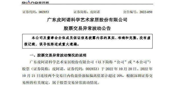 10月23日晚间,皮阿诺(002853.SZ)公告称,公司于2022年10月20日、2022年10月21日连续两个交易日内收盘价涨幅偏离值累计超过 20%,根据深圳证券交易所的有关规定,属于股票交易异常波动情况。公开资料显示,10月20日开盘,股价为15.68元/股;10月21日收盘,股价为18.98元/股。