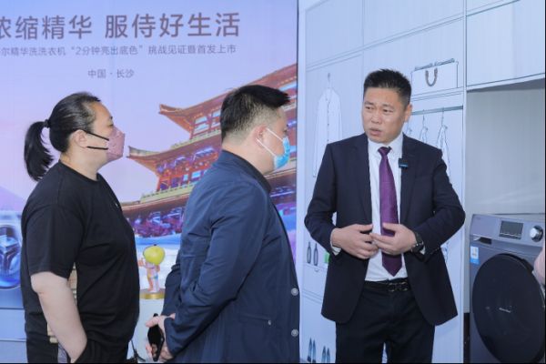 直播现场,海尔洗衣机发布了最新原创“精华洗”洗衣机,颠覆传统水洗方式,以“精华湿洗”为用户带来“常洗常新”的洗护新体验,现场让湖南客户、达人零距离体验“精华湿洗”科技。