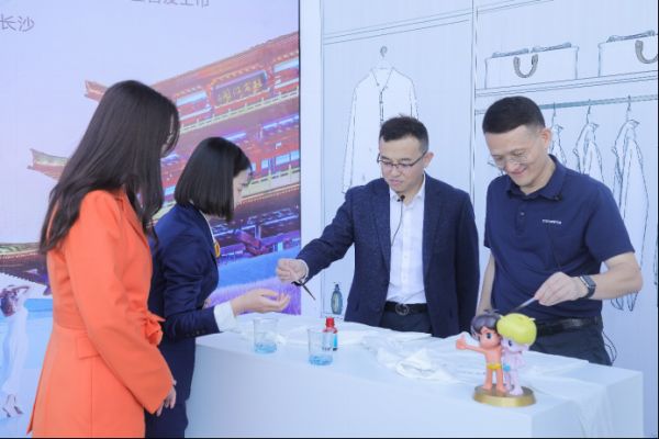 在现场,工作人员还通过10层衬衣浸润实验,展示“精华湿洗”的深层浸润效果。高浓度“精华液”滴在10层衬衣上可以快速渗透,说明“精华液”对衣服深层纤维的浸润效果远超普通水洗,能够更好地洗净衣服深层纤维的污渍。