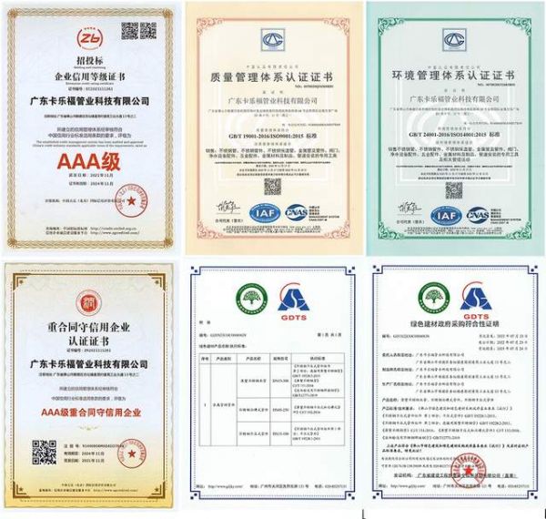 截止目前,凭借着产品与服务优势,卡乐福已经取得了《招投标信用AAA企业》、《重合同守信用企业认证证书》、《绿色建材政府采购符合性证明证书》、《售后服务体系完善程度认证证书》等工程资质,这意味着卡乐福的产品质量、服务水平和信誉程度均得到了社会的认可。相信未来,卡乐福不锈钢水管会继续走进更多的工程项目当中去,为实现“让人类喝上健康好水”而奋斗不止。