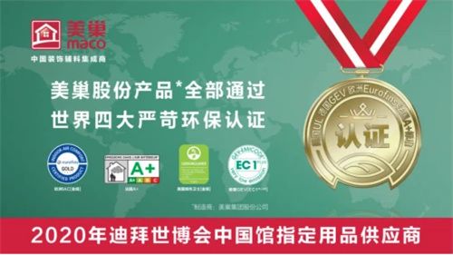在国内,只有美巢产品全部通过美国UL绿色卫士【金级】认证、欧洲Eurofins IAC【金级】认证、德国GEV【EC1PLUS】认证以及法国【A+】这四大严苛环保认证的最高级标准,美巢集团更是凭借其优异的环保品质,成为2020年迪拜世博会中国馆指定用品供应商。