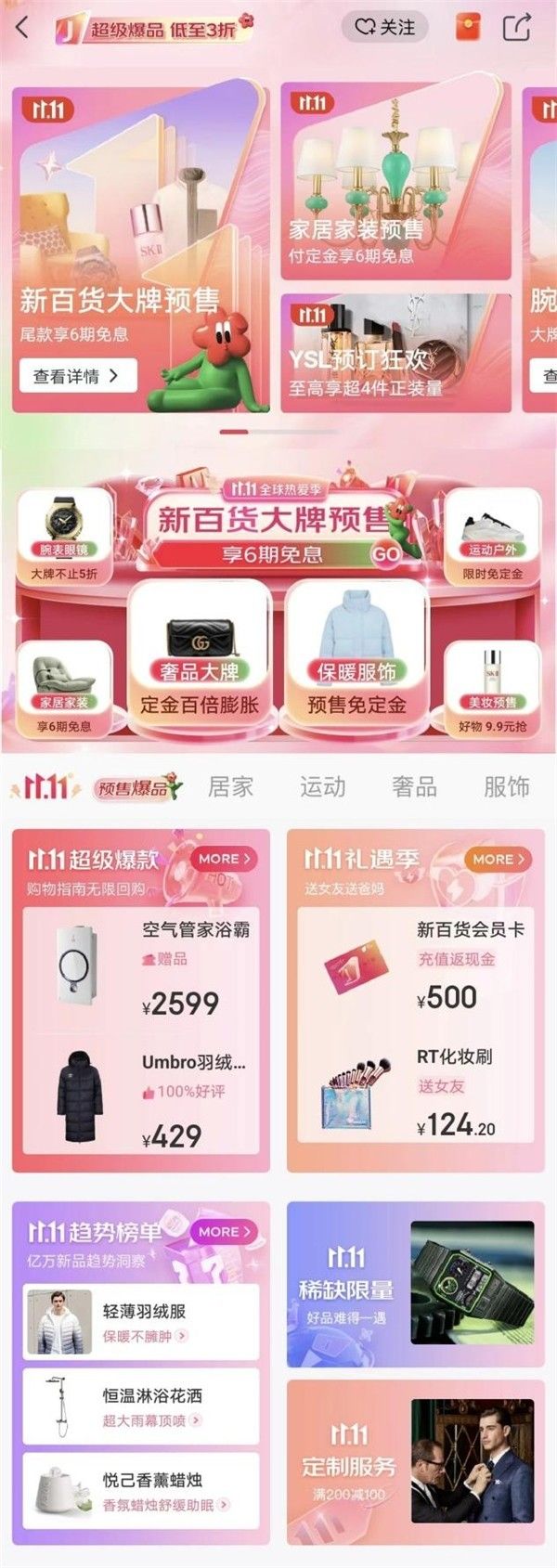 作为集线上线下消费体验于一体的新时尚生活精选集合业态,京东新百货在10月20日晚8点就正式开启了预售,并推出“大牌预售享6期免息”优惠,后续还将有“赢老板就免单”“超级爆品正品大牌低至9.9”等优惠活动。今年京东11.11期间,京东新百货将携时尚服饰、品质居家、美妆护肤、运动户外、奢品钟表五大品类,为消费者带来“实在”的购物体验,更有全链路服务、全渠道营销加码,满足消费群体新时尚生活消费需求。