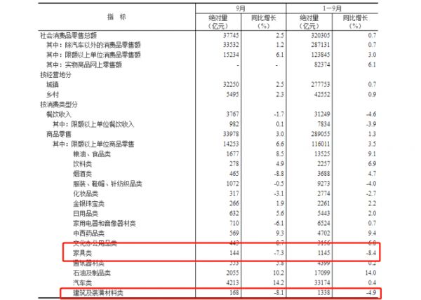 10月24日,国家统计局发布2022年1-9月国民经济运行情况。9月份,全国家具类零售总额为144亿元,同比下降7.3%;建筑及装潢材料类零售总额为168亿元,同比下降8.1%。另外,今年前三季度,全国家具类零售总额为1145亿元,同比下降8.4%;建筑及装潢材料类零售总额为1338亿元,同比下降4.9%。