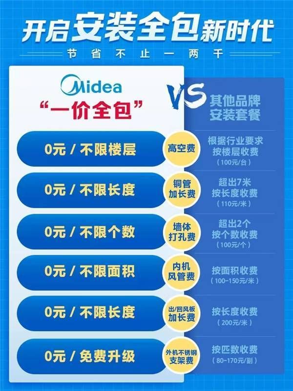 俗话说: “家电买回家,安装费接着花”,上门起步价100元,打孔100元/个,加铜管150元/米,加长出风口200元/米等等,“层层加码”的安装费让用户看了直迷糊。为了解决信息不对称带来的限制行业发展的问题,美的集团先是尝试规定材料和服务费,虽然情况有所改善,但是依然不能彻底解决需要额外支付安装费的情况。