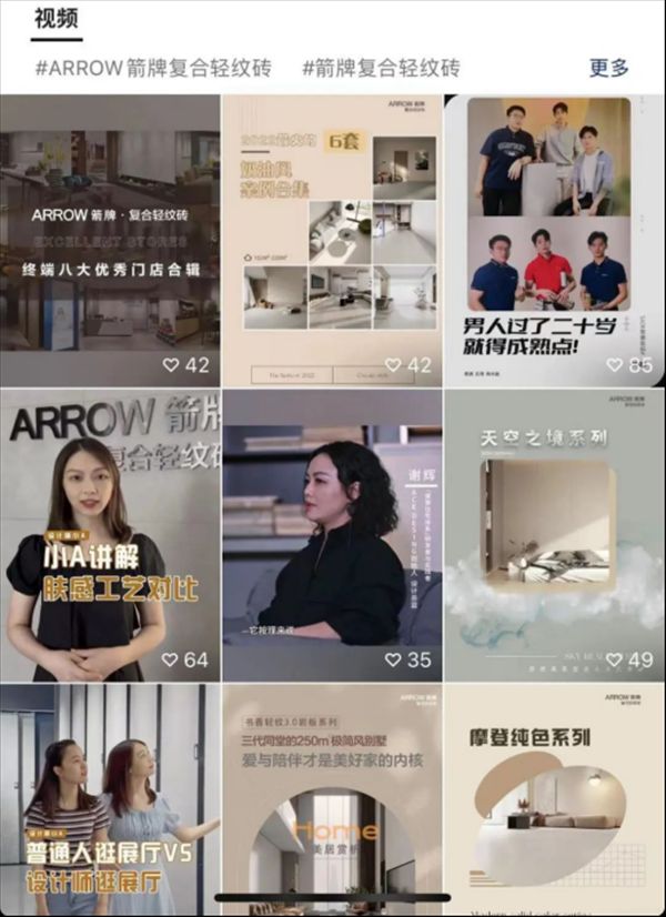 为保证内容的多样化,箭牌复合轻纹砖巧妙地将产品结合热点话题输出,在创作者、内容创作和平台运营上同时发力,将内容扩散至不同圈层,集中放大品牌的曝光度,引爆产品卖点,赋能线下门店,让新媒体工具成为了提高线下转化率的强有力的“武器”。