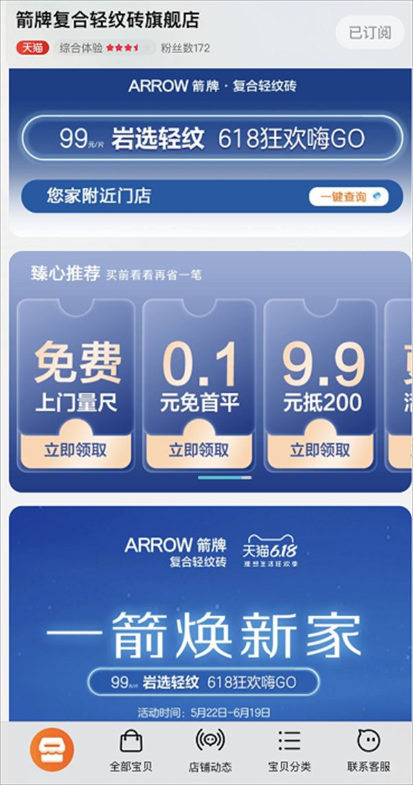 依托天猫平台口碑和公域流量,在今年618年中购物节中,箭牌复合轻纹砖得到多重推广效应,线上旗舰店实现了30万的曝光量,为线下门店引流作出了重要的一环。