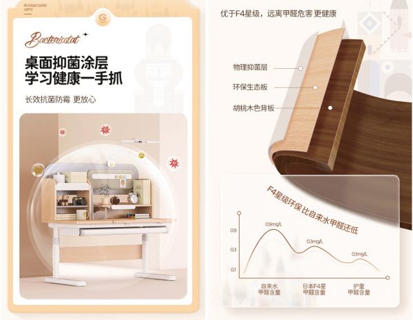 环保健康是儿童学习桌最基础的保障。护童胡桃夹子学习桌甲醛含量远低于国家标准,优于F4星级标准,环保健康无异味,送装到家即可安心使用。桌面还增加了抑菌涂层,对常见的金黄色葡萄球菌、大肠杆菌等细菌具有高达90%以上的抗菌效果,防霉等级1级,南方的梅雨季也不用担心。若对实木学习桌情有独钟,也可以选择护童橡胶木款的胡桃夹子学习桌。