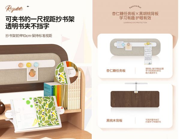 以一尺视距抄书架、杏仁糖任务板为例,护童胡桃夹子学习桌还有很多专业的细节设计,都能很好地助力孩子良好学习习惯的养成。参考国家标准坐姿“三个一”的要求,护童将一尺视距抄书架做了前伸10cm的处理,孩子只要拉开抄书架,保持端正坐姿,就能确保一尺科学视距,缓解眼部疲劳。为了防止放在抄书架上的书本自动翻页,还配置了透明书夹,使用方便更贴心。