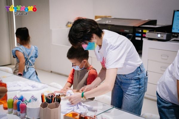 数码印花是现在工厂打印产品用到的工艺,小朋友现场画的画作可以通过“数码打印”的方式印在T恤、家居服、抱枕、丝巾、手提袋上。穿着自己设计的T恤,拿着设计的手提包,可以想到小朋友超满足的表情!