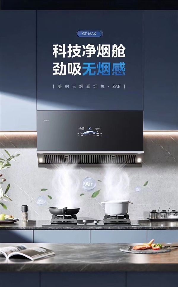 为了用户能够获得更好的厨居空间烹饪呼吸体验,同样为通过技术开拓烟机领域发展新高度,美的通过多重净烟科技,打造更强吸力、更广覆盖、更近烟源的净烟新物种——美的无烟感烟机ZA8。