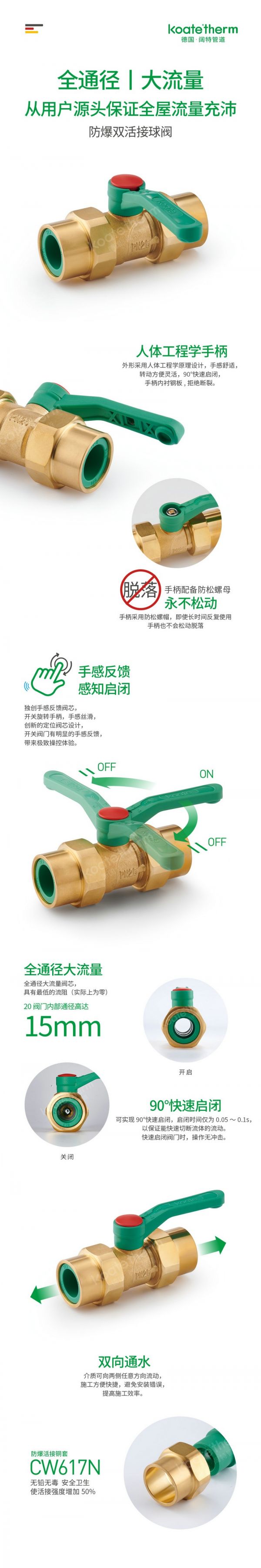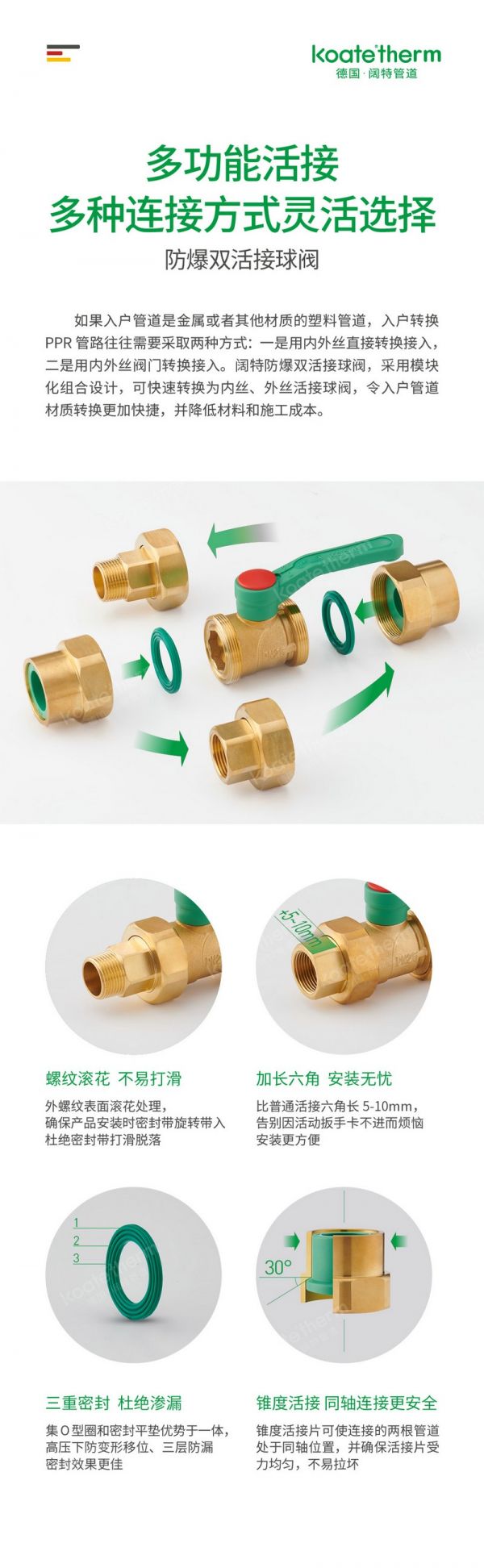 德国阔特防爆双活接球阀,采用大流量阀芯设计,流量“0”衰减,可以从用户源头保证全屋流量充沛。
