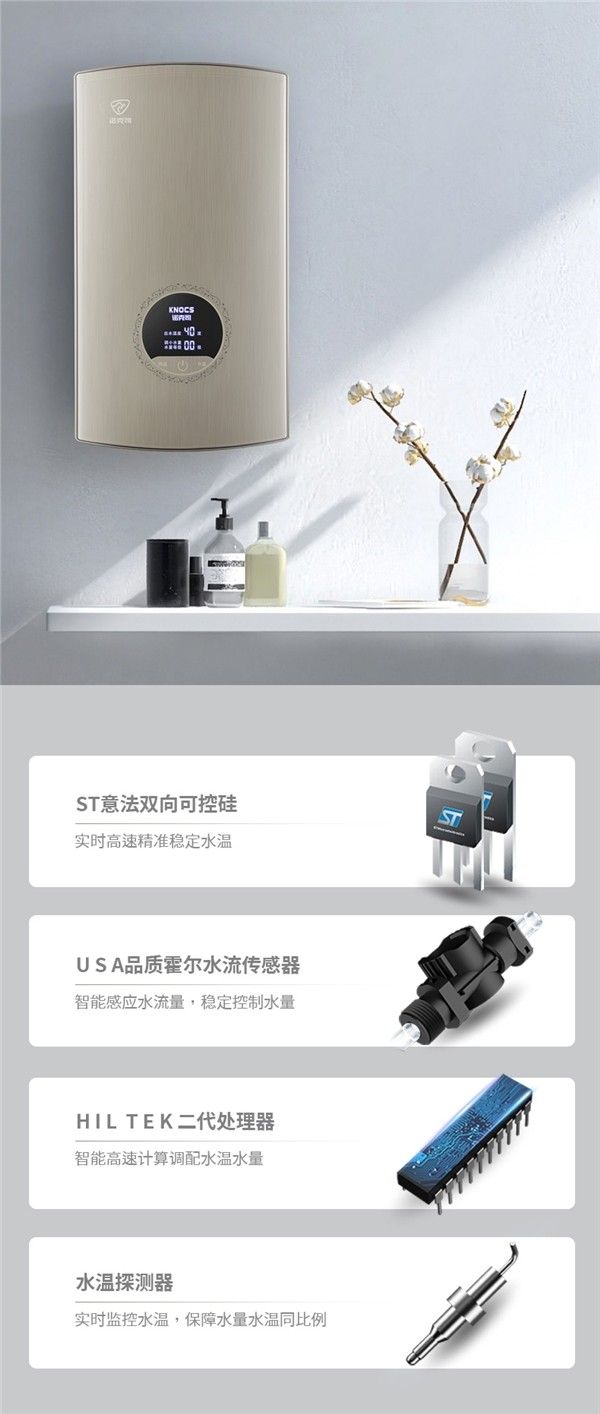 诺克司星炫E2即热式热水器采用业内领先的双ST可控硅,搭配USA品质霍尔水流传感器、HIL TEK二代处理器、高精度水温探测器全程自动恒温调节,让你彻底摆脱水温忽冷忽热的烦恼。