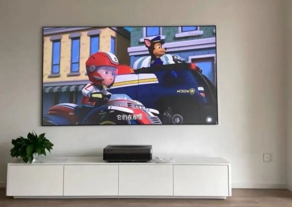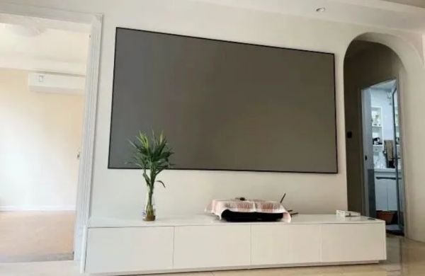 其次,激光电视的光学屏幕因为通过反射主机成像光线呈现画面,所以本身并不需要通电发光。也因此,相较于普通平板电视,一方面激光电视的光学屏幕不需要电源线,让电视背景墙不需要通过开孔的方式来遮挡电源线;另一方面激光电视的光学屏幕不需要内置繁杂的电子元器件,可以做得更轻薄,也不需要在安装时为其预留散热空间。