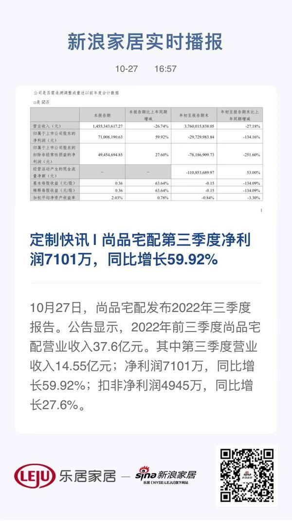 新浪定制频道讯 10月27日,尚品宅配发布2022年三季度报告。公告显示,2022年前三季度尚品宅配营业收入37.6亿元。其中第三季度营业收入14.55亿元;净利润7101万,同比增长59.92%;扣非净利润4945万,同比增长27.6%。
