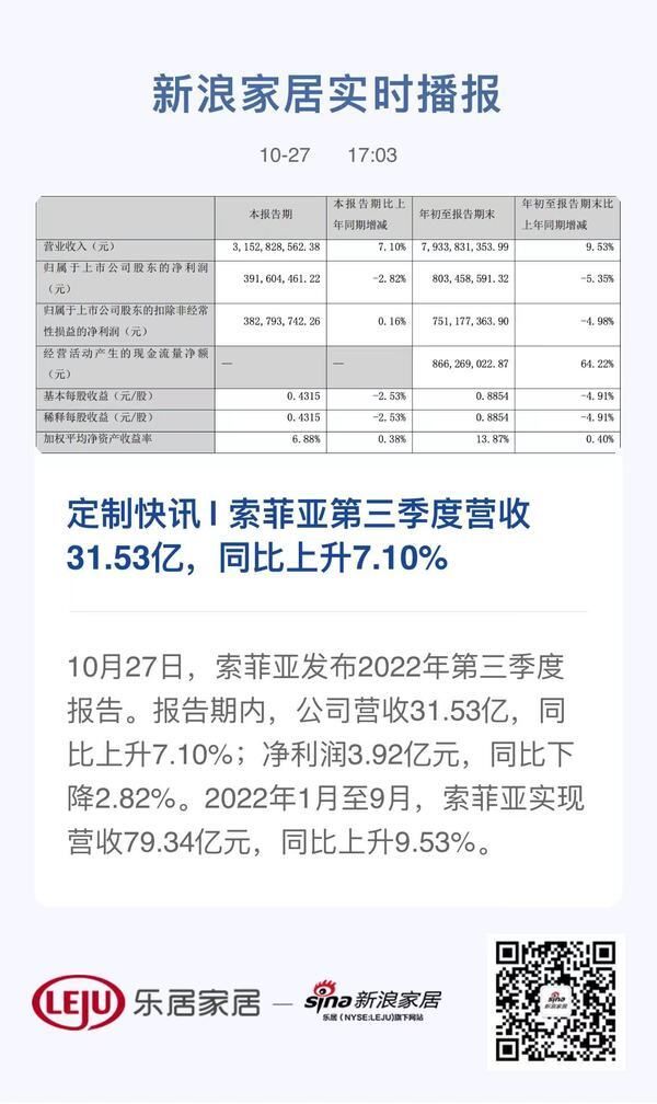 新浪定制频道讯 10月27日,索菲亚发布2022年第三季度报告。报告期内,公司营收31.53亿,同比上升7.10%;净利润3.92亿元,同比下降2.82%。2022年1月至9月,索菲亚实现营收79.34亿元,同比上升9.53%。