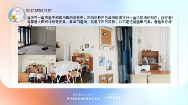 通过一系列具体案例,王升广总监展示了24节气在家居中的实际运用。壁挂姑娘与猫是一名家居博主,在新居客厅中,她大胆选用立春时节配色“草木新”,在墙面上大面积地使用野麦黄色,并搭配淡绿色等蓝绿色系的装饰画、抱枕等软装,与野麦黄相互呼应,营造出了清新和活力的家居氛围。而且浅亮的颜色有助于光线传播,也让客厅看起来更加宽敞。