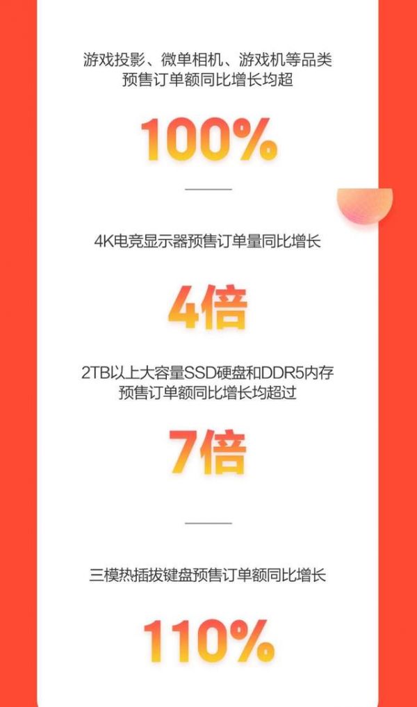 同时,游戏投影、游戏机等品类预售订单额同比增长也均超过100%。此外,游戏爱好者对网速、显示效果、性能配置也提出了更加严苛的要求,4K电竞显示器预售订单量取得了同比增长4倍的好成绩,2TB以上大容量SSD硬盘和DDR5内存的预售订单额也同比增长均超过7倍,三模热插拔键盘预售订单额同比增长110%。