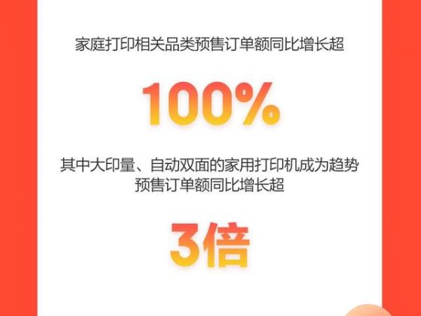 此外,随着居家学习和办公成为了当下常态,打印机正在变得更加智能化、更加切合用户的个性化需求,家用打印机正成为学生一族、办公白领的必备好物。从京东11.11电脑数码的预售战报数据可以看到,家庭打印相关品类预售订单额同比增长超100%,其中大印量、自动双面的家用打印机成为趋势,预售订单额同比增长超3倍。
