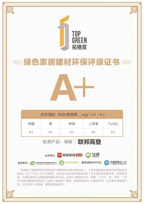 早在2014年,联邦高登便率先启用满足更高环保标准的“联邦高登绿板”。2019年,联邦高登绿板通过了以号称“史上最严”的《住宅建筑室内装修污染控制技术标准》JGJ/T436-2018(下称《标准》)为参考标准的拓格奖检测。其中,联邦高登绿板的甲醛、TVOC、苯、甲苯、二甲苯5项指标全部达到《标准》规定的F1等级,被评定为A+等级。