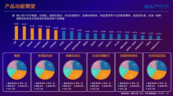 据白皮书调研结果显示,洗地机核心用户对无线蒸汽洗地机的接受度较高,其中,重度清洁者对新产品的接受度最高;从对新品的各项功能评价来看,用户关注最高的是无线化,相较市场上已有的有线蒸汽洗地机和蒸汽拖把等产品,无线化能够带来更好的产品体验,让使用时更加便捷,此外就是高温蒸汽、热水洗地等可以更高效的去除油污、杀菌,也得到了核心人群的关注。