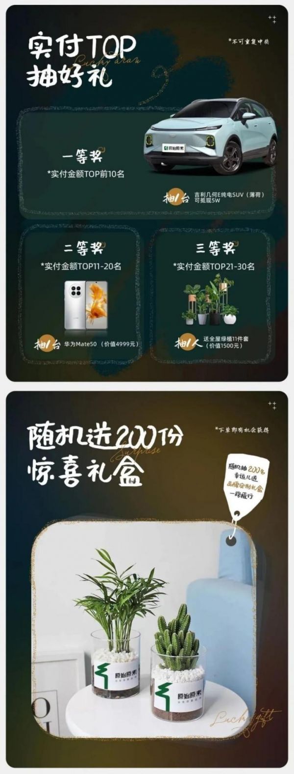 在「家之外」已经足够紧绷了,回到「家」就尽管享受。原始原素助力大家寻找一种新的,自然的,探索模式下的生活方式,通过实木传递自然温度,居家也在和自然相处。同时,原始原素也以最大的诚意为消费者带来了福利抽奖活动:实付Top10的消费者可享抽取吉利几何纯电SUV的福利、实付Top11-20的消费者获得抽取价值4999元华为Mate50的资格、实付Top21-30即送全屋绿植11件套(价值1500元)。与此同时,原始原素还将随机抽200名幸运儿送出品牌定制礼盒【一路植行】,下单即可参与。