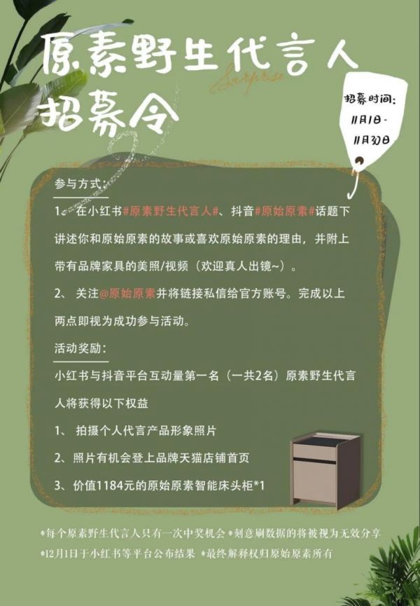 除此以外,这个双十一原始原素还有花呗3期免息、指定货品直接半价、轻奢材质特价7折、店铺专享券等优惠好礼奉送,活动力度可谓是前所未有。11月1日还会推出「原素野生代言人」的活动,参与即可有机会再赢福利。另外,各大线下实体店也会推出相关福利优惠,大家记得关注。