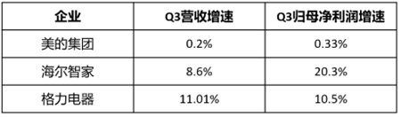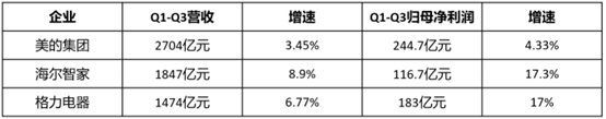 从Q3单季度看,美的营收增长0.2%,归母净利润增长0.33%;海尔智家营收增长8.6%,归母净利润增长20.3%;格力营收增长11.01%,归母净利润增长10.5%。