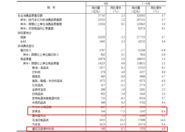 另外,今年前三季度,全国家具类零售总额为1145亿元,同比下降8.4%;建筑及装潢材料类零售总额为1338亿元,同比下降4.9%。