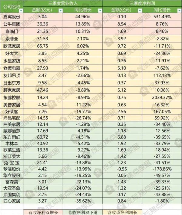 其中嘉寓股份增长幅度最高,为44.96%,匠心家居下滑幅度最大,为35%;净利润方面,仅有10家实现增长,其余18家均有不同程度下滑,其中东鹏控股增长幅度最高,达2039.37%,梦洁股份下滑最大,为178.86%。