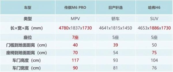 传祺M6 PRO整车大小4780×1837×1730mm,轴距更是长达2810mm。通过对比轿车和SUV的门槛及座椅到地面距离明显看出,传祺M6能够让各种身形的成年人轻松通过,同时也方便老弱人群上下车,成年人亦可以直接以与站立相平的姿态直接坐下。相比主打家用的轿车和SUV,传祺M6 将家用的优势卷到了极致。