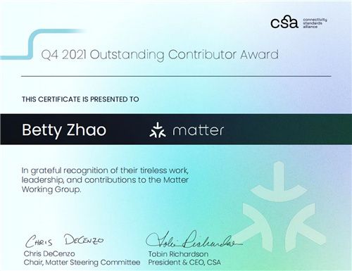 为解决这一问题,从2019年开始,海尔智家在内的行业头部企业以及来自世界各地数以百计的工程师,便开始聚力开发一套全球可用的互联互通标准,也就是Matter。在2021年,海尔智家荣获CSA季度贡献奖,为Matter作出重要贡献。