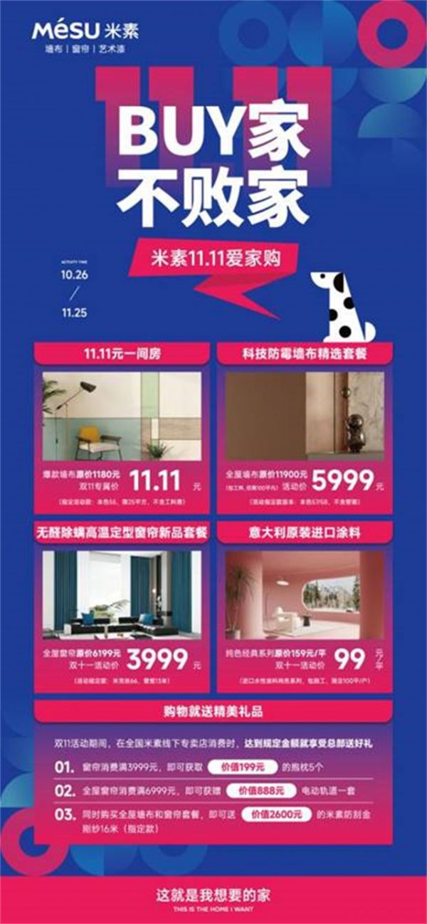 一年一度双十一狂欢季的钟声已经敲响,又是一波剁手“败家”的风暴来袭。买买买虽然很快乐,但在压力倍增的当下,省钱已然成为一门学问,用更少的钱买到更好的东西,显然能够带来更大的快乐。选对正确血拼姿势,不熬夜、不吃土、拒绝盲目剁手败家,抢占BUY家优惠福利,今年双十一,米素软装让你“BUY家不败家”。10.26—11.25,米素“11.11爱家购”活动火热进行,带你打开全新买买买模式!