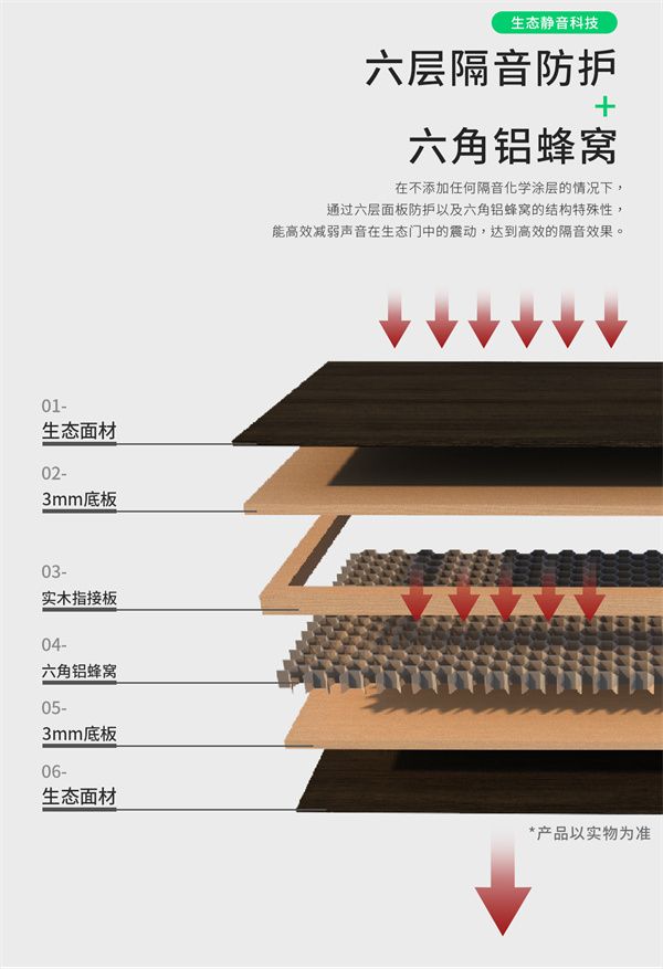 其次,顶固生态门从不同材质对于声波的传递性能着手优化降噪,门扇6层材料逐层过滤声波;被削弱后的声波传递到六角铝蜂窝材料层时,网状内气体形成天然缓冲带,减缓声波传递、减少声音反射形成噪音,达到舒适睡眠的安静效果。