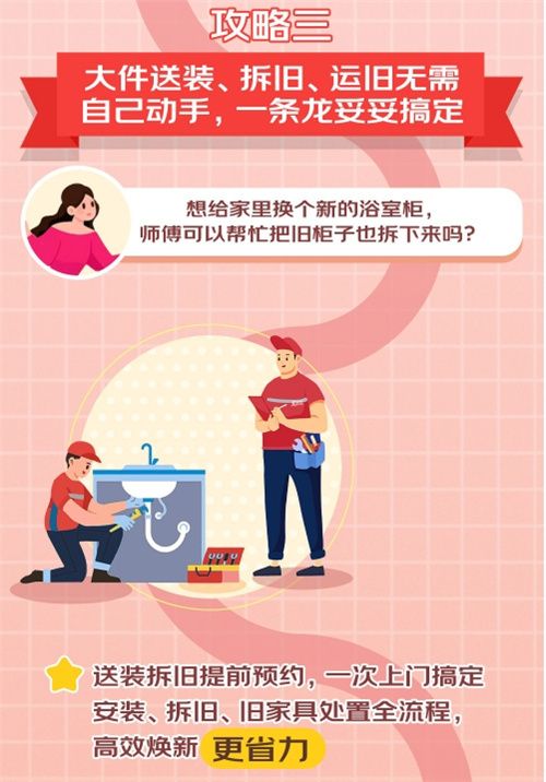 对于浴室柜、洗脸面盆、淋浴装置等在墙面“生根”的居家商品,消费者希望焕新的同时能拆旧,并进行旧物回收处理。没问题,京东“省心装”妥妥帮您搞定!送装拆旧预约上门,无需自己动手,京东师傅一次上门搞定安装、拆旧、旧家具处置全流程,高效焕新更省力。