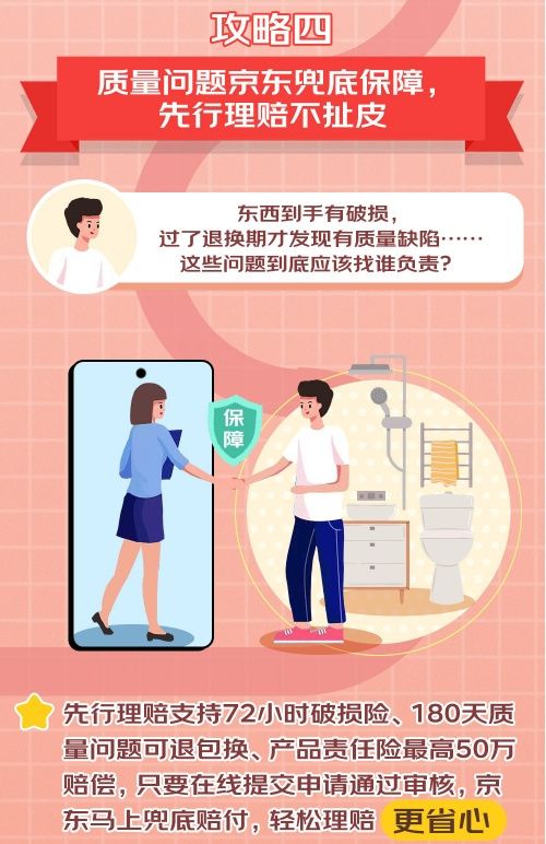 一些消费者疑惑,居家商品到手有破损,或过了退换期才发现有质量缺陷,这些问题到底该由谁负责?别担心,质量问题京东兜底保障!先行理赔服务支持72小时破损险、180天质量问题可退包换、产品责任险最高50万赔偿。消费者只需在线提交申请通过审核,京东马上兜底赔付,轻松理赔让售后更省心。