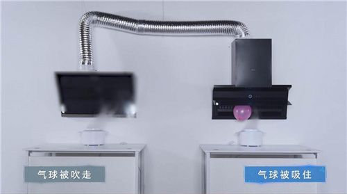在有效风烟机与普通大风量烟机的对吹挑战中,工作人员将两台油烟机的出风口用一根排烟管连接,然后将烟机风量调至最大,打开实验烟锅。普通烟机吸不走油烟,还造成了油烟倒灌逃逸;有效风油烟机不仅可以轻松吸净实验烟,还吸住油烟机下方的气球,并吹跑对方烟机下的试验气球,在对吹挑战中完胜。