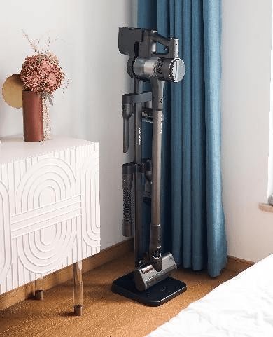 除此之外,值得一提的是,这款吸尘器的旗舰版,配置的还是可拆卸双电池包。每个电池包内置7*2500mAh大容量进口三星电池组,续航可达55min。一备一用,双倍电量,随换随续。配合多款专用刷头,无需频繁充电,即可一次性完成全屋清洁。而且,自带的落地挂架是收纳充电二合一的,吸尘器跟电池包放上去,就能开始充电,完全不需要担心用的时候会没电。