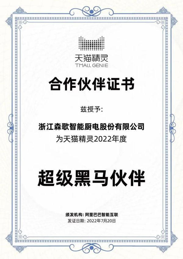 此次受邀阿里巴巴云栖大会也是基于两者多年紧密的合作与联系,在今年7月20日举办的“2022天猫精灵生态伙伴大会”上,凭借出色的产品力,森歌智能厨电成功斩获天猫精灵2022年度“超级黑马伙伴”。