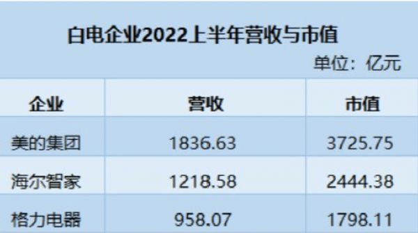 从2022年上半年财务数据来看,美的集团、海尔智家、格力电器营业收入分别为1826.61亿元、1218.58亿元、958.07亿元,同比增长5.09%、9.1%、4.58%。
